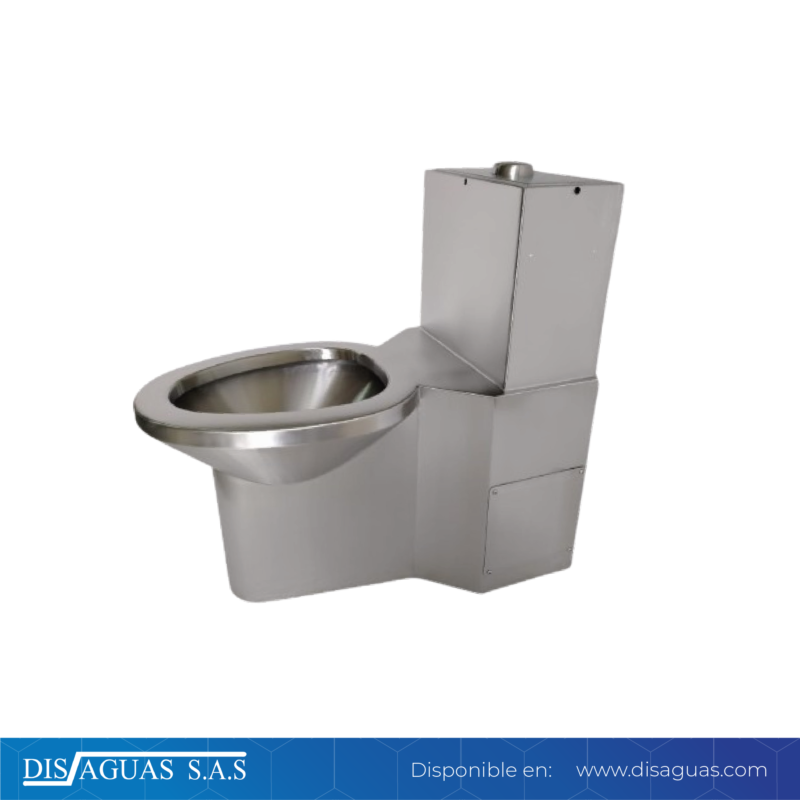 Sanitario Anti vandálico con desagüe a piso. Sus medidas son de 353 x 714 x 697 h mm Fabricado en lámina de acero inoxidable (AISI 304)calibre 16. Compuesto por 2 piezas: un tanque de acumulación de agua con sistema de vaciado y la taza que se cubre con un faldón el cual posee dos tapas de inspección (una a cada lado) para poder instalar el sanitario y realizar posteriores labores de mantenimiento. El producto tiene un peso aproximado de 18 Kg, Su acabado es satinado, posee botón de descarga de baja presión por gravedad con un Consumo de 5 litros, Árbol de la cisterna incluido.